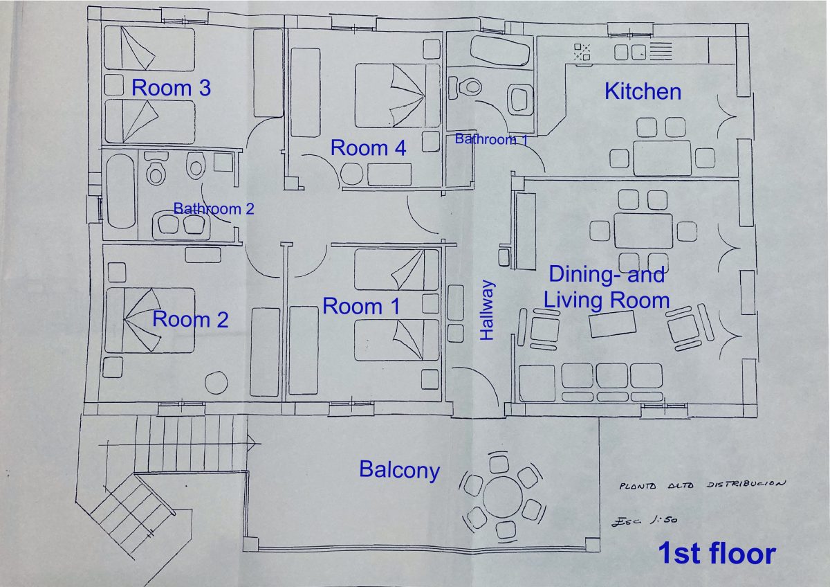 A beautifully tiled staircase leads from the driveway to a spacious balcony on the first floor and the main entrance. An inviting hallway connects the following rooms: