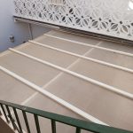 at the end of the hallway is the back door leading out to a perfectly tiled patio , part of which has a striped shading awning, to the rear of ghe patio is a tidy laundry room and a store room .