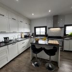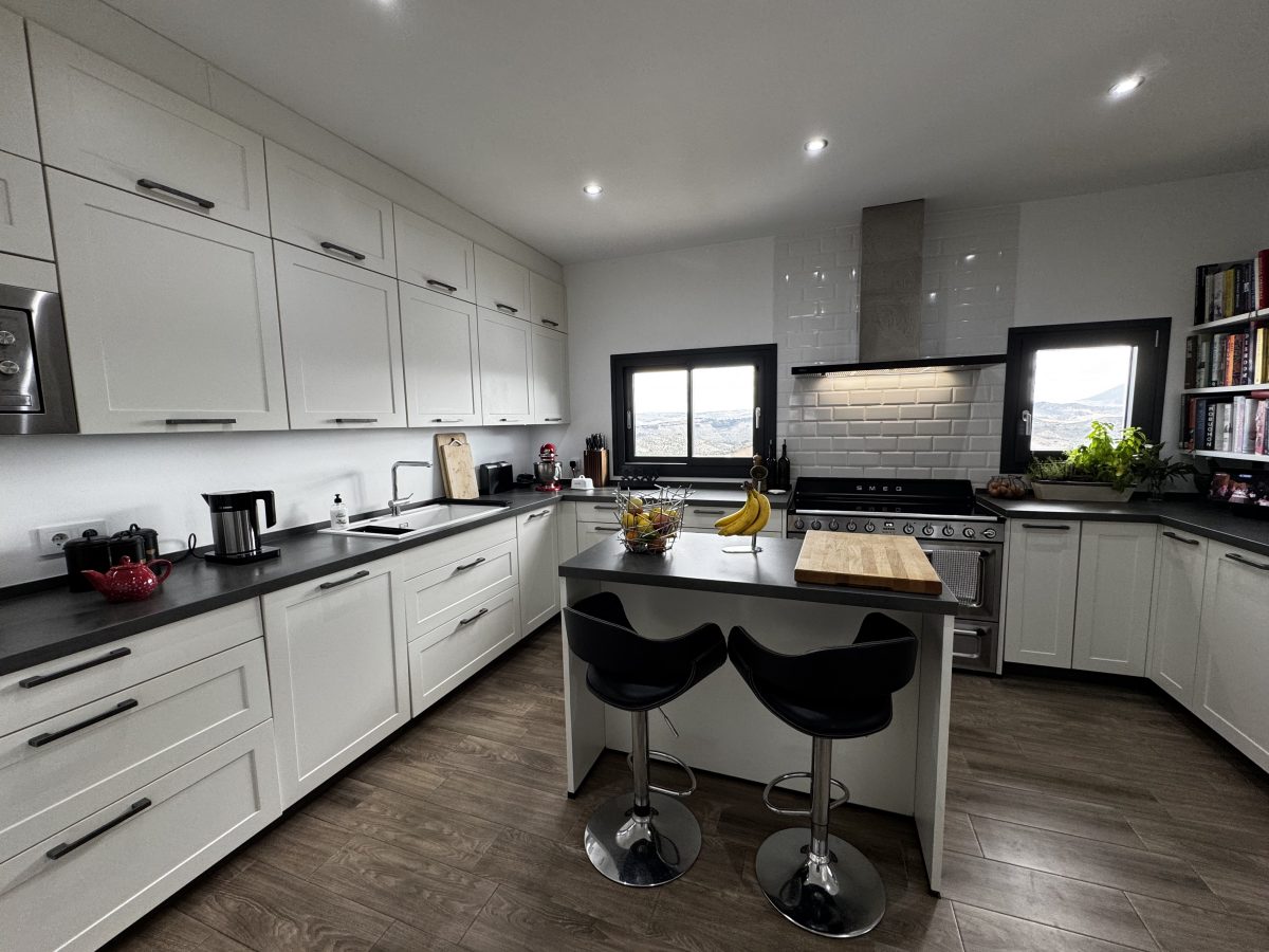 Step through the elegant San Juan glass entrance and you’re instantly greeted by a glimpse of those spectacular views. The spacious open-plan living and dining area features high ceilings, abundant natural light, and a cosy pellet burner for cooler evenings. The modern kitchen is beautifully fitted, complete with a breakfast bar and large windows that frame the mountain vistas.
