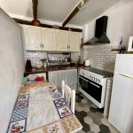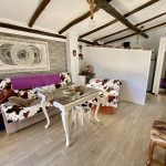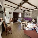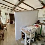 Entering  you have a lounge room with beamed ceilings , a wood burning stove and air conditioning, a half wall separates the rustic style kitchen which has ample storage and counter space .