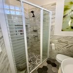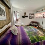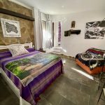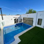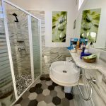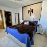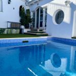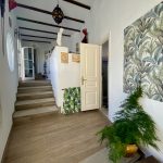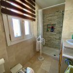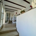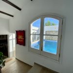 Back into the lounge and a doorway leads into a wide hallway area which has windows and doors leading out to the pool patio and gives access to the family bathroom which is beautifully finished with marble tile on the walls , a walk-in shower with pebble effect flooring , and niches for your shower gels etc , a sink and loo complete this bathroom .At the end of the hall is the master suite , a spacious bedroom with full bathroom and a walk in wardrobe, a beautiful arched window brings in light and views over the pool .