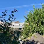 The small facade is beautifully enhanced by climbing  plants that also give shade to the private parking space .