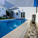Out to the very private pool courtyard with plenty of space for loungers and a built bench for seating , the pool is 4 meters by 5 and has waterfall feature at one end , the pool pump is located below the patio area and accessed via a hatch in the floor of the patio .